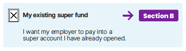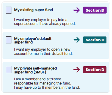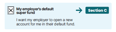 You don’t have a choice of which default super fund your employer nominates. But, you can choose to accept their super fund or join a different super fund. If you join a different super fund, complete a new version of this form and complete Section B.