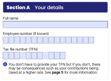 1. Complete your name and Tax File Number (TFN) if you have it ready. If you don’t have a TFN, check out our about page on Tax File Numbers.