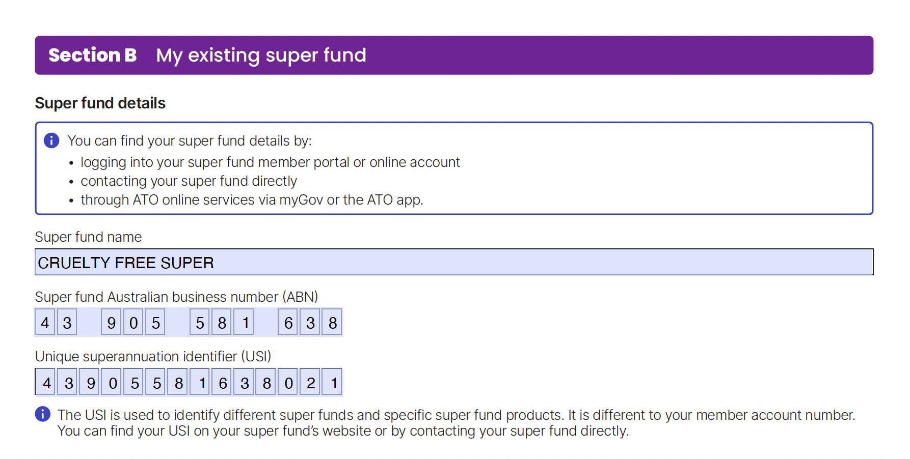 If you have an existing super fund, you will need to complete Section B of the form. For Cruelty Free Super members, here are the details to complete this section.