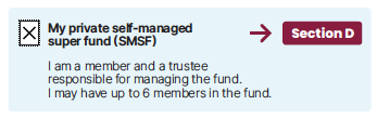 If you have a SMSF, you will likely know it. You will need to complete the SMSF details including the bank account details (these are not your personal bank account details!) – consult your accountant if you need assistance.